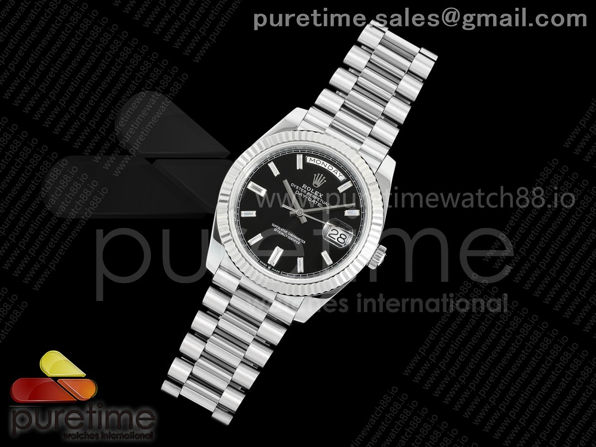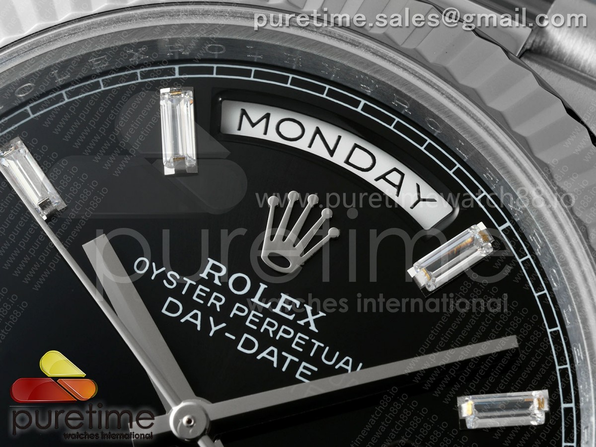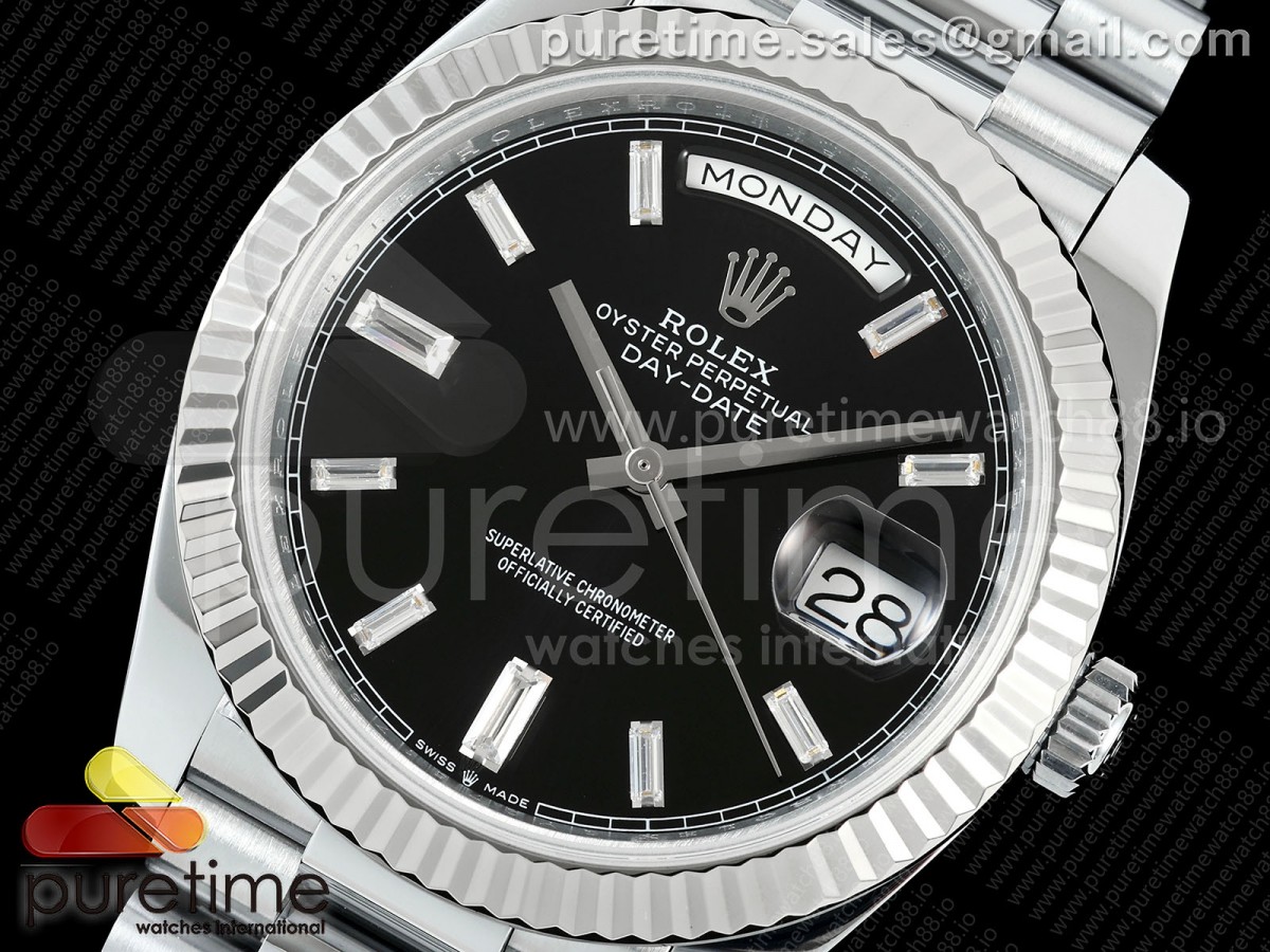 • QF V6 롤렉스 데이데이트40 텅스텐(Cu-W) 블랙바게트다이얼 스틸브레이슬릿 199g DayDate 40 SS QF 1:1 Best Edition Black Crystal Dial on President Bracelet A2836 V6 (Gain Weight)