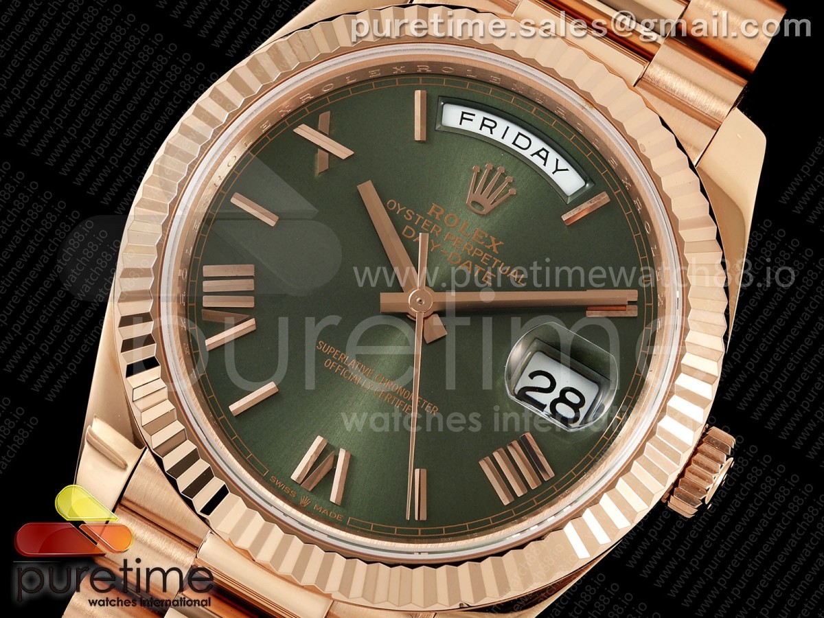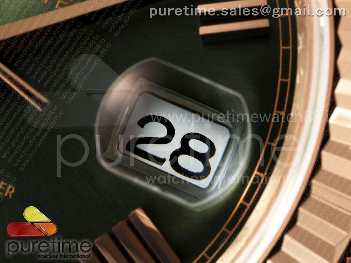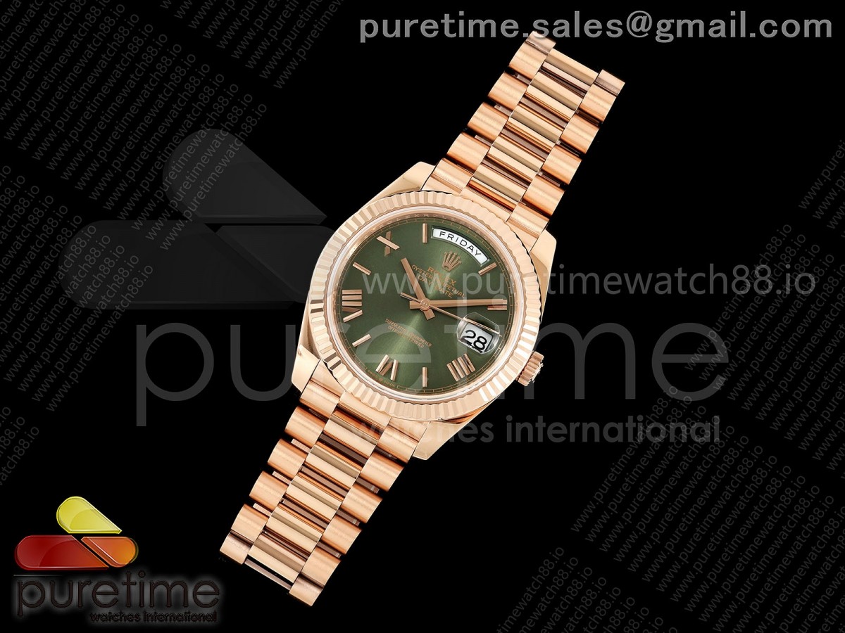 QF V6 롤렉스 데이데이트40 로즈골드 텅스텐(Cu-W) 그린로만다이얼 스틸브레이슬릿 199g DayDate 40 RG QF 1:1 Best Edition Green Roman Dial on President Bracelet A2836 V6 (Gain Weight) > 데이데이트(DAYDATE)