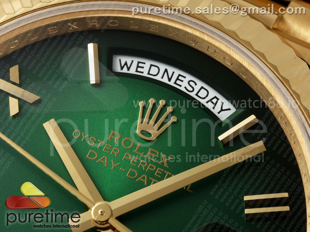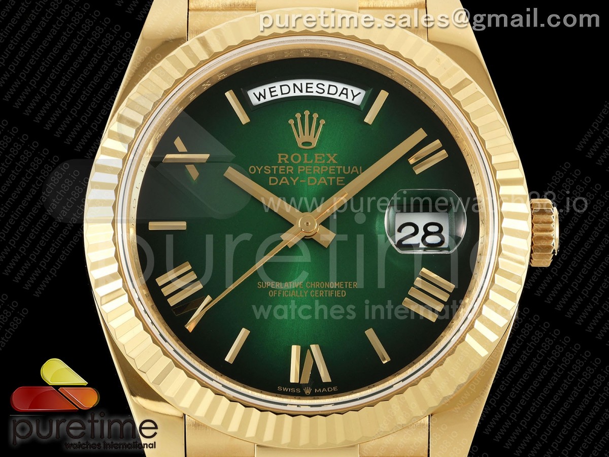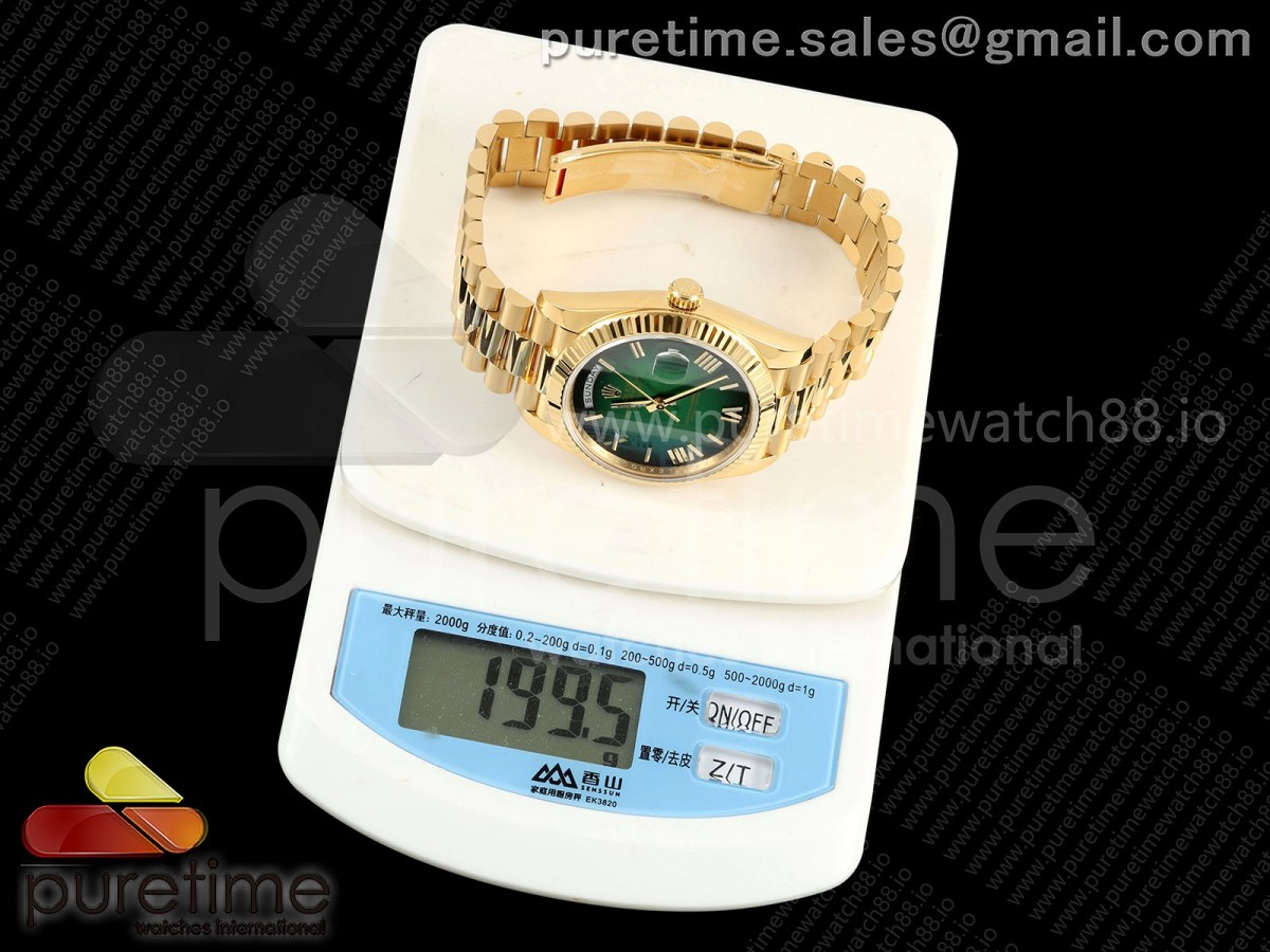 QF V6 롤렉스 데이데이트40 옐로우골드 텅스텐(Cu-W) 그린로만다이얼 스틸브레이슬릿 199g DayDate 40 YG QF 1:1 Best Edition Green Ombre Roman Dial on President Bracelet A2836 V6 (Gain Weight)ght) > 데이데이트(DAYDATE)