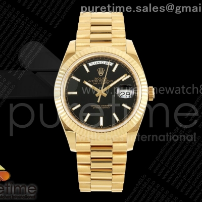 QF V6 롤렉스 데이데이트40 옐로우골드 텅스텐(Cu-W) 블랙다이얼 스틸브레이슬릿 199g DayDate 40 YG QF 1:1 Best Edition Black Stick Dial on President Bracelet A2836 V6 (Gain Weight) > 데이데이트(DAYDATE)