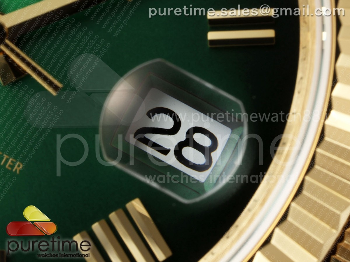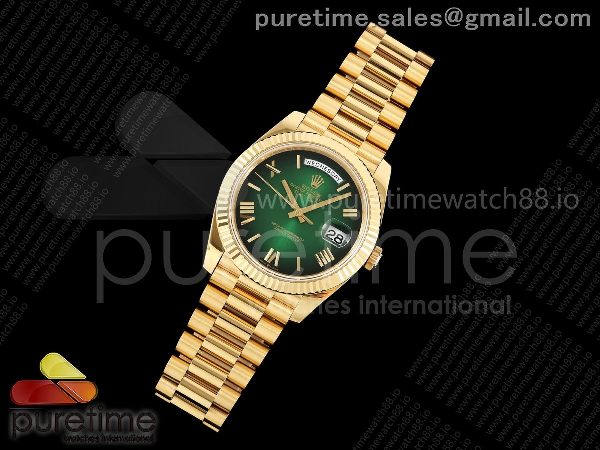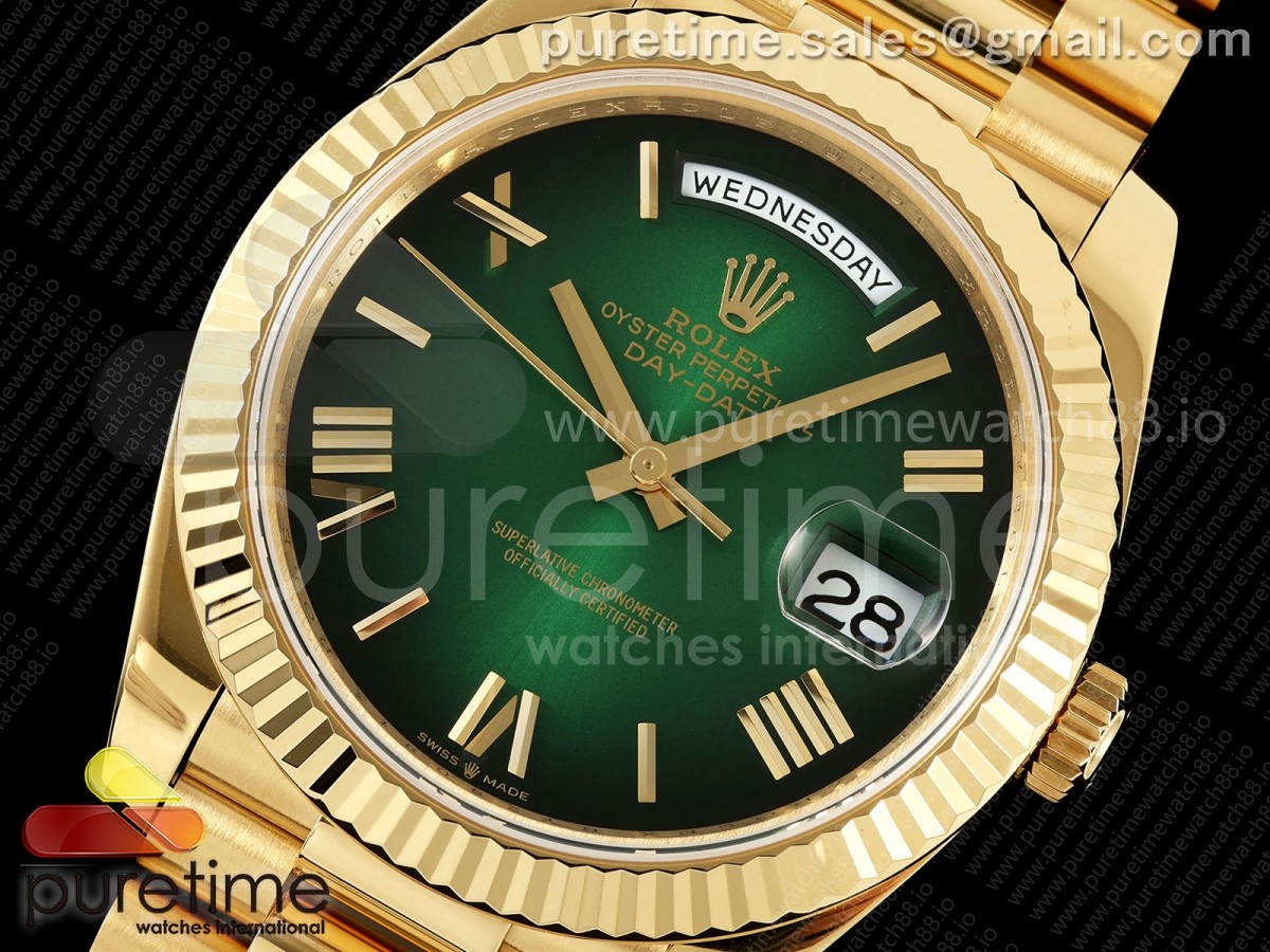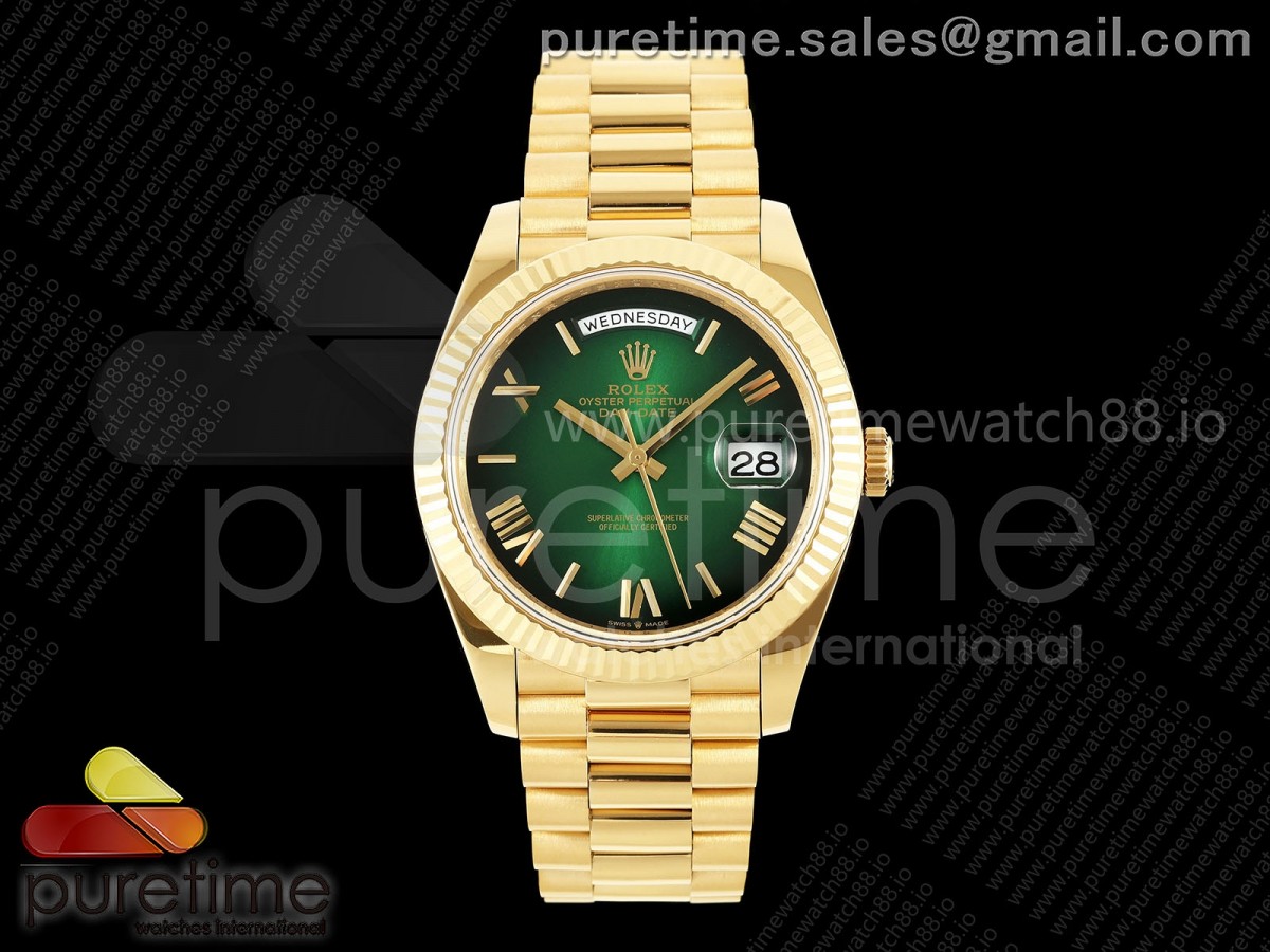 • QF V6 롤렉스 데이데이트40 옐로우골드 텅스텐(Cu-W) 그린옴브레로만다이얼 스틸브레이슬릿 199g DayDate 40 YG QF 1:1 Best Edition Green Ombre Roman Dial on President Bracelet A2836 V6 (Gain Weight)