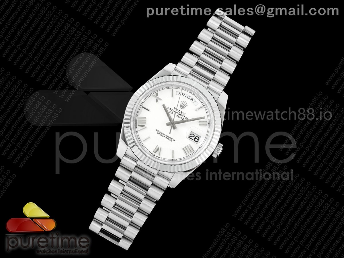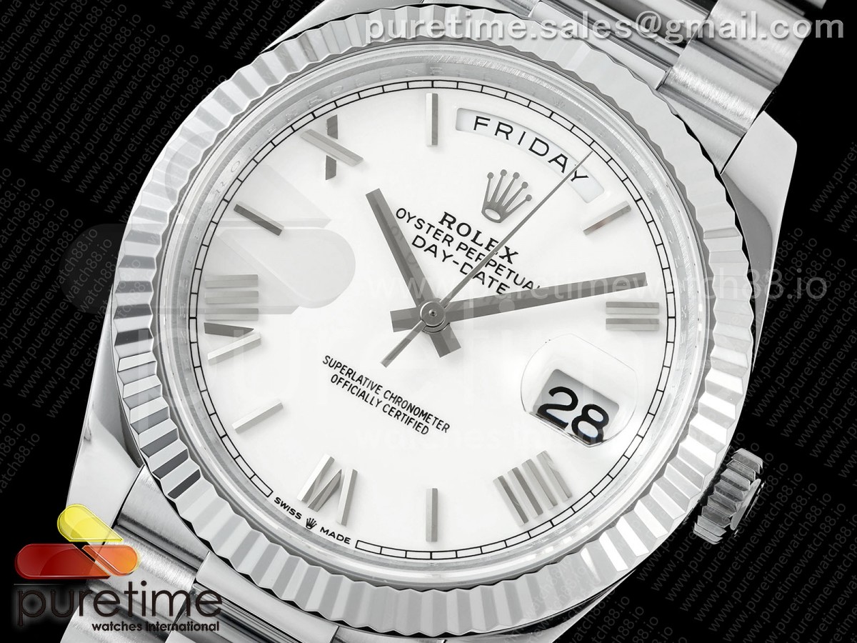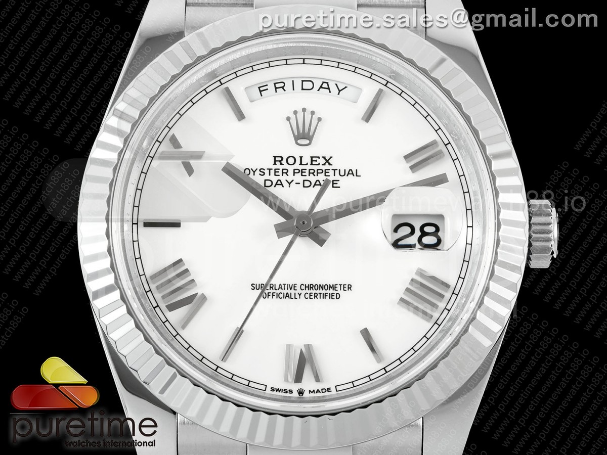 QF V8 롤렉스 데이데이트40 텅스텐(Cu-W) 화이트로만다이얼 스틸브레이슬릿 190g DayDate 40 SS QF 1:1 Best Edition 904L Steel White Roman Dial on President Bracelet VR3255 V8 (Gain Weight) > 데이데이트(DAYDATE)