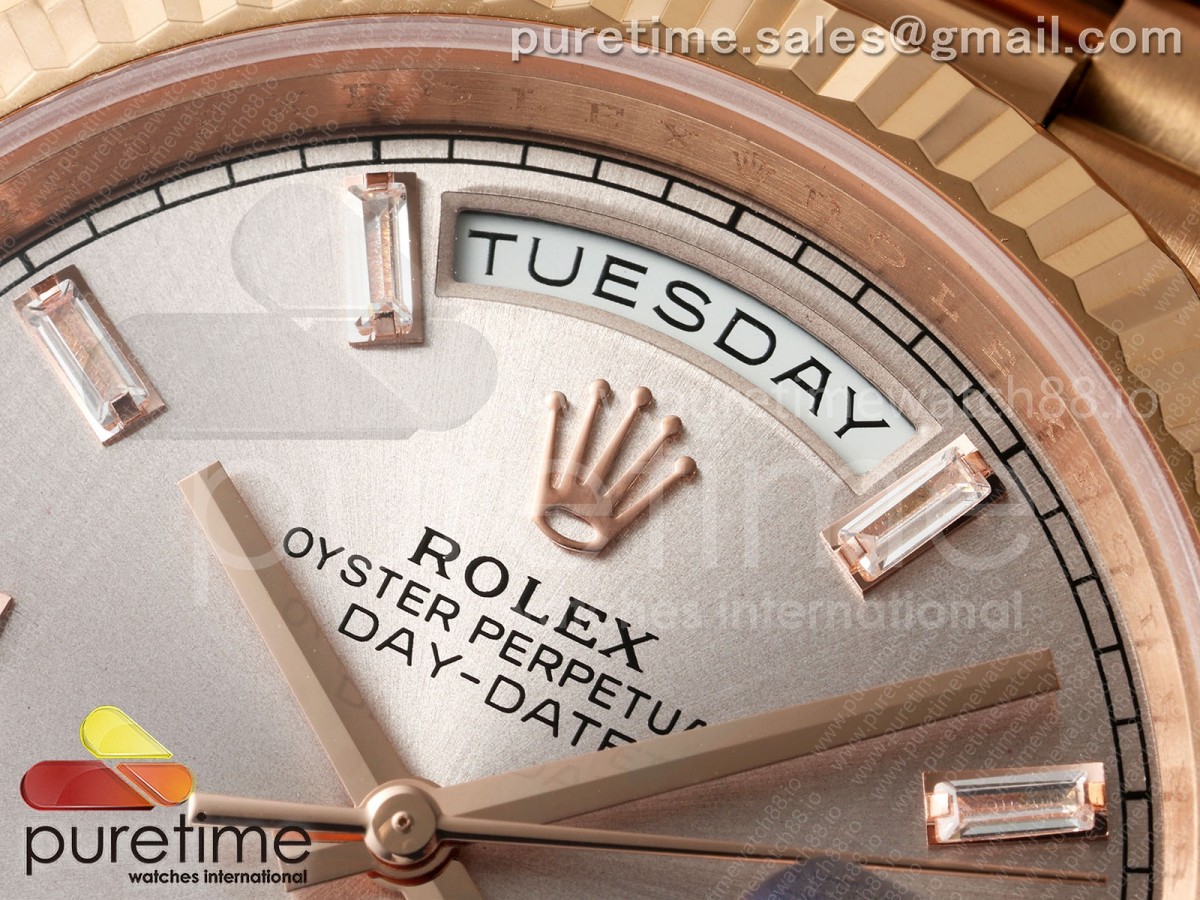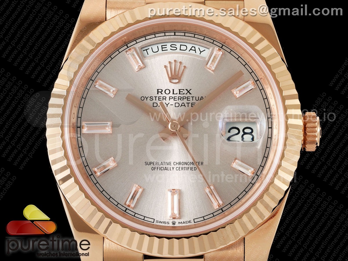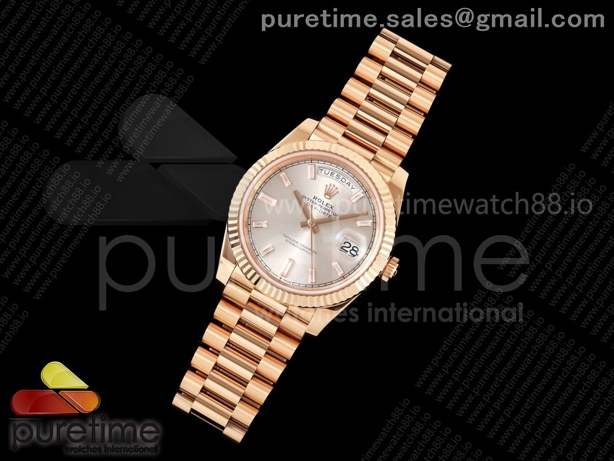 • RCF 롤렉스 데이데이트40 로즈골드 텅스텐(Cu-W) 로골바게트다이얼 스틸브레이슬릿 210g Day Date 40 RG RCF 1:1 Best Edition RG Crytal Dial on President Bracelet VR3255
