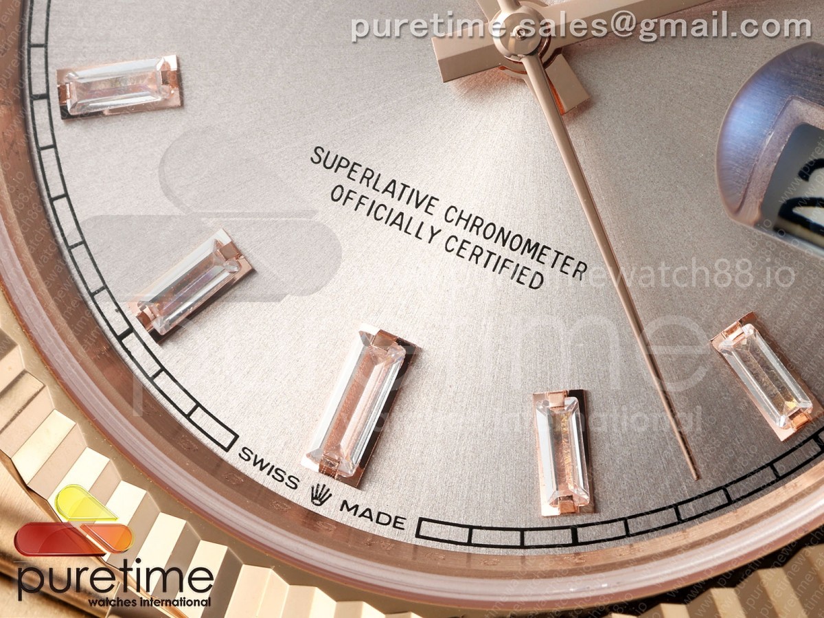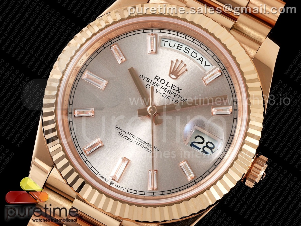 RCF 롤렉스 데이데이트40 로즈골드 텅스텐(Cu-W) 로골바게트다이얼 스틸브레이슬릿 210g Day Date 40 RG RCF 1:1 Best Edition RG Crytal Dial on President Bracelet VR3255 > 데이데이트(DAYDATE)